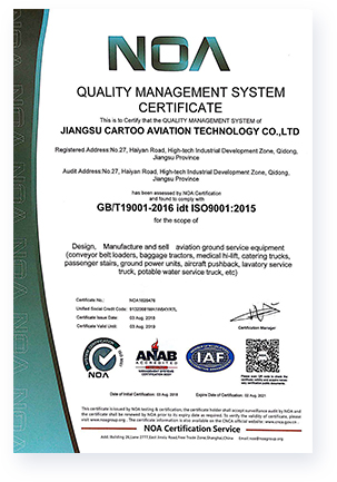 目前公司產(chǎn)品已覆蓋機(jī)場(chǎng)包括飛機(jī)服務(wù)、行李貨運(yùn)地面服務(wù)、航空旅客服務(wù)以及新能源機(jī)場(chǎng)服務(wù)等適用領(lǐng)域,并可按用戶要求提供各類定制產(chǎn)品的設(shè)計(jì)和生產(chǎn)服務(wù)。公司所有產(chǎn)品設(shè)計(jì)和生產(chǎn)滿足國(guó)際民航組織(IATA)和中國(guó)民航總局(CAAC)設(shè)備技術(shù)要求,工廠生產(chǎn)流程嚴(yán)格按照ISO質(zhì)量管理體系,于2018年8月成功通過(guò)了質(zhì)量體系ISO9001:2015認(rèn)證。